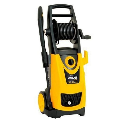 1 Lavadora de alta pressão, acompanha: reservatório embutido para detergente , 1 mangueira de alta pressão com trama de aço com 5 m, 1 enrolador para mangueira embutido, 1 cordão elétrico com 5 m, 1 lança com bico ajustável, 1 lança com bico turbo, 1 pistola com gatilho, 1 manômetro e 1 conector de 1/2".